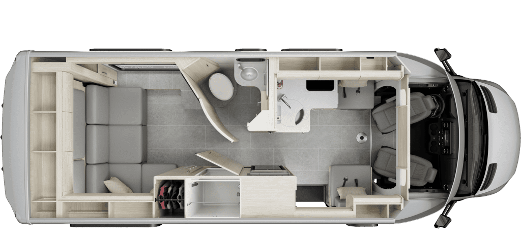 The 2025 Unity U24RL by Leisure Travel Vans is designed for travelers who want maximum flexibility without sacrificing luxury. With its groundbreaking Rear Lounge floorplan, this Class B+ motorhome delivers two distinct living spaces in a compact, easy-to-drive package. Enjoy a residential-style rear lounge with a sectional sofa, dual power recliners, and expansive windows that flood the space with natural light. By night, the lounge transforms into a spacious master suite thanks to a cleverly integrated Murphy bed system. At the front, a removable dinette offers comfortable seating for four and can be converted into an optional guest bed.